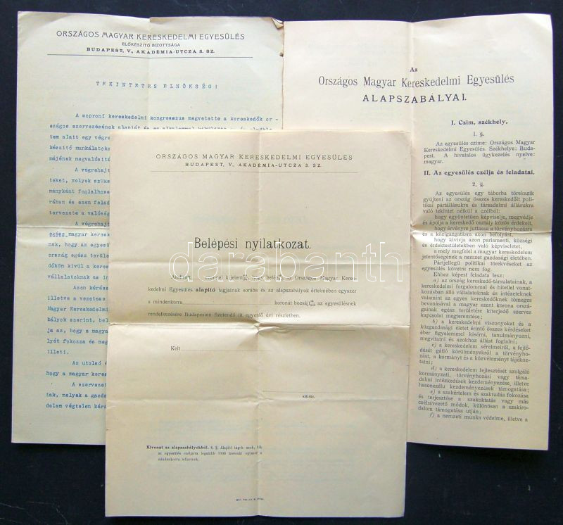 1903 Országos Magyar Kereskedelmi Egyesülés belépési felhívás Sándor Pál országgyűlési képviselő, az egyesülés későbbi vezérigazgatója eredeti aláírásával + alapszabály + 3 kitöltetlen belépési nyilatkozat