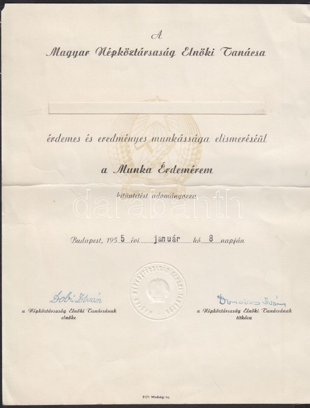 Beschreibung: 1955 Dobi István, az Elnöki Tanács elnökének aláírása emléklapon