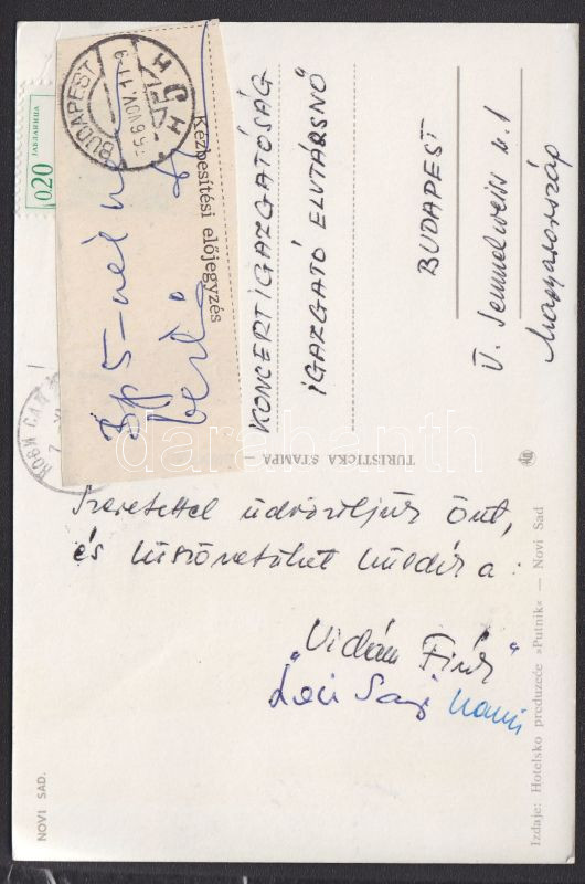 Beschreibung: 1966 A Vidám Fiúk fúvószenekar tagjainak aláírása képeslapon
