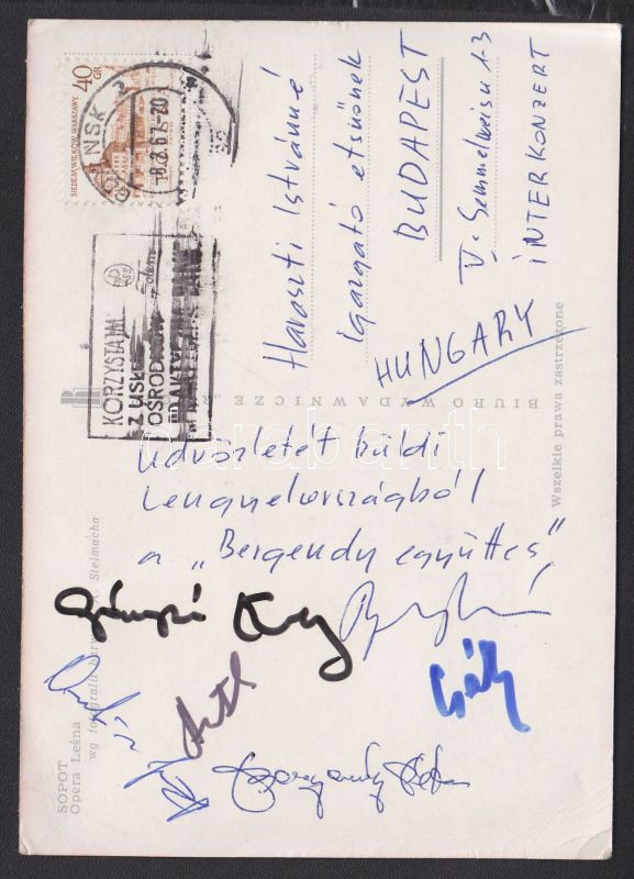Beschreibung: 1967 Bergendy Együttes tagjainak aláírása képeslapon