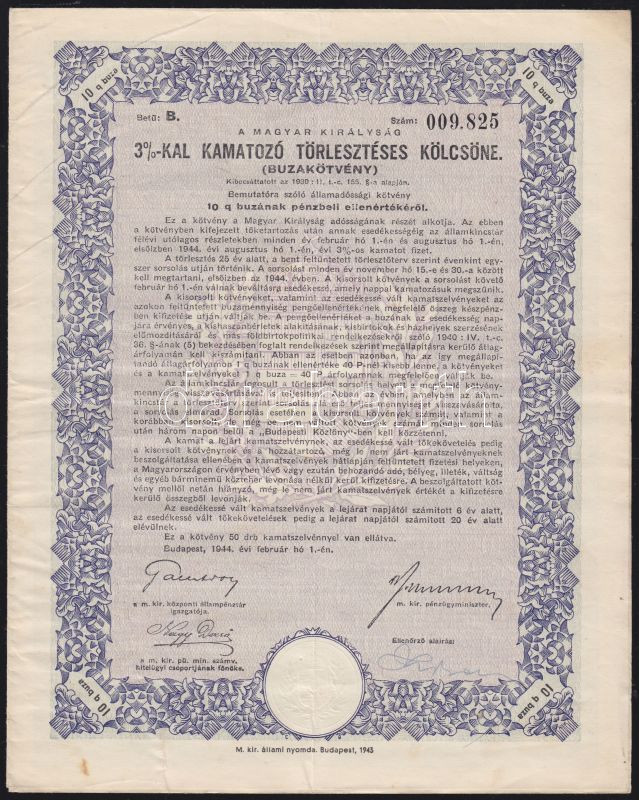 1944. A Magyar Királyság 3%-kal kamatozó törlesztéses kölcsönének 10q / 400P-ős búzakötvénye