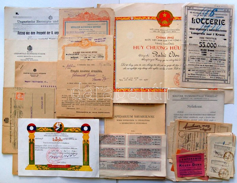 Beschreibung: Numizmatikával kapcsolatos vegyes tétel részvényekkel, irodalommal, banki és pénztári iratokkal magyar illetve külföldi darabokkal T:vegyes