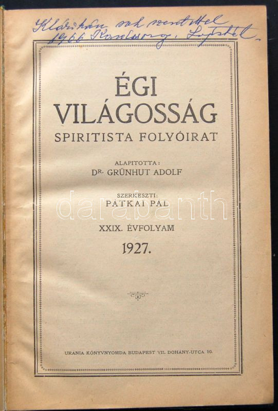 1927 Égi Világosság Spiritista folyóirat teljes évfolyama bekötve https://www.darabanth.com/de/135-Fernauktion/135.0/Andere-Sammelgebiete/Bucher-sonstige-Raritaten~303/1927-Egi-Vilagossag-Spiritista-folyoirat-teljes-evfolyama-bekotve~II389967