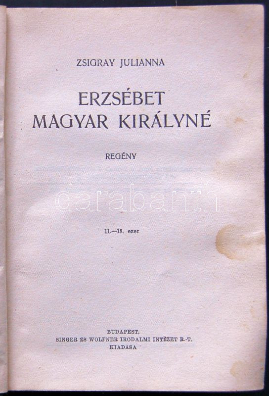 1938 Zsigray Julianna: Erzsébet magyar királyné, Singer és Wolfner kia... https://www.darabanth.com/de/135-Fernauktion/135.0/Andere-Sammelgebiete/Bucher-sonstige-Raritaten~303/1938-Zsigray-Julianna-Erzsebet-magyar-kiralyne-Singer-es-Wolfner-kiado-viseltes-allapotban~II388856
