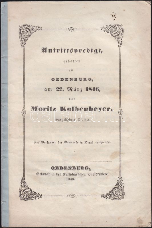 Kolbenheyer Móric soproni ev. prédikátor: 1846. márc. 22.-én tartott b... https://www.darabanth.com/de/135-Fernauktion/135.0/Andere-Sammelgebiete/Bucher-sonstige-Raritaten~303/Kolbenheyer-Moric-soproni-ev-predikator-1846-marc-22-en-tartott-beszede-Kultsar-nyomda-~II388027