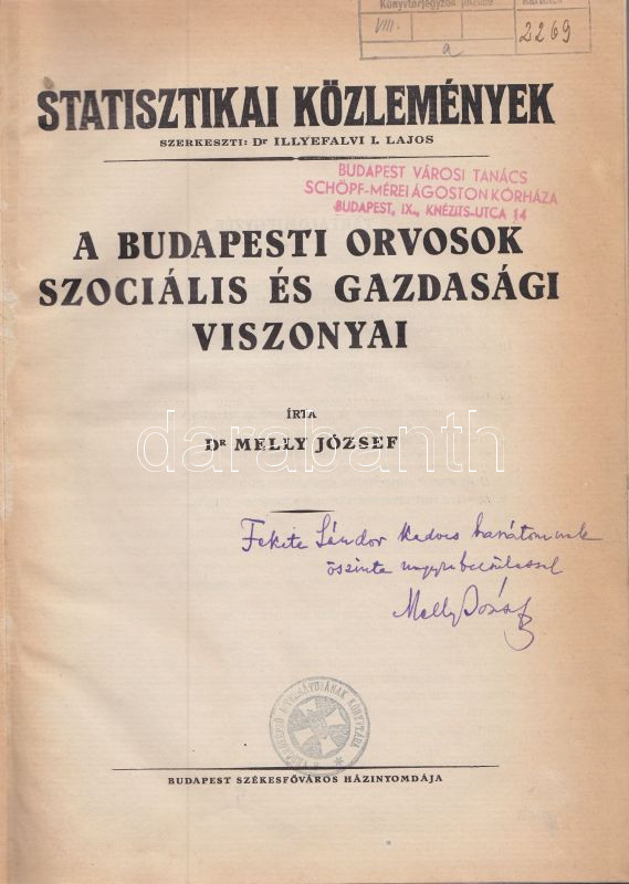 Beschreibung: Statisztikai Közlemények - Dr. Melly József: A budapesti orvosok szociális és gazdasági viszonyai , az író pár sorával és aláírásával