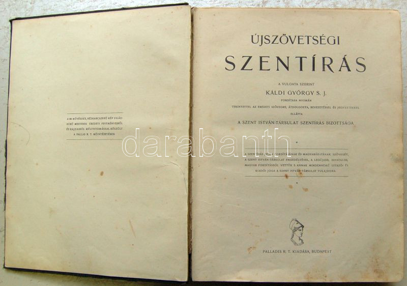 Újszövetségi Szentírás a Vulgata szerint Káldi György fordításában, Palladis Rt, 1928. 20 művészies, rézkarcszerű képpel, aranyozott, dombornyomott, kissé kopottas bőrkötésben