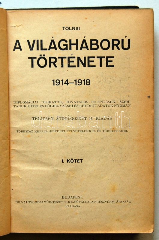 cca 1925 Tolnai Világtörténelme - A világháború története I. kötet, Budapest, Tolnai Nyomdai Műintézet és Kiadóvállalat Rt. kiadásában, több száz képpel, térképekkel, jó állapotban