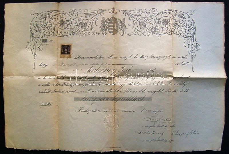 1922 Államszámviteli bizonyítvány merített, címeres papíron 50x35 cm https://www.darabanth.com/de/135-Fernauktion/135.0/Andere-Sammelgebiete/Dokument~287/1922-Allamszamviteli-bizonyitvany-meritett-cimeres-papiron-50x35-cm~II382358