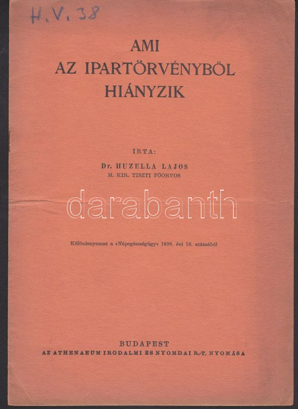 1936 Dr. Huzella Lajos: Ami az Ipartörvényből hiányzik, Atheneum Rt. n... https://www.darabanth.com/de/135-Fernauktion/135.0/Andere-Sammelgebiete/Drucksachen~298/1936-Dr-Huzella-Lajos-Ami-az-Ipartorvenybol-hianyzik-Atheneum-Rt-nyomasa-Bp~II389952