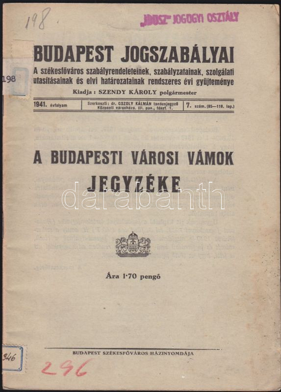1941 Budapest Jogszabályai - A budapesti városi vámok jegyzéke https://www.darabanth.com/de/135-Fernauktion/135.0/Andere-Sammelgebiete/Drucksachen~298/1941-Budapest-Jogszabalyai--A-budapesti-varosi-vamok-jegyzeke~II388858
