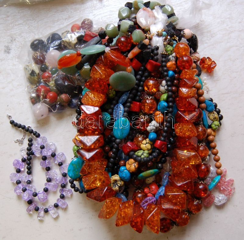 Beschreibung: 25 db féldrágakő nyaklánc + 25 db féldrágakő fülbevaló : korall, tenyésztett gyöngy, ametiszt, achát, jáspisok, borostyán, füstkvarc, lapis lazuli, stb.