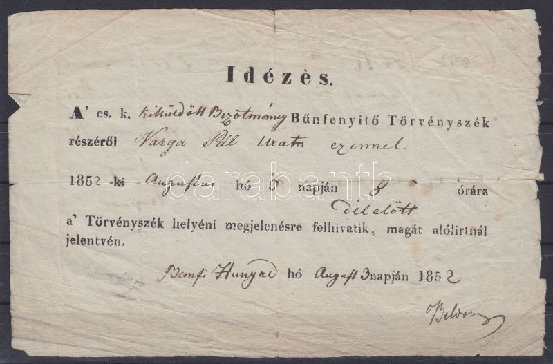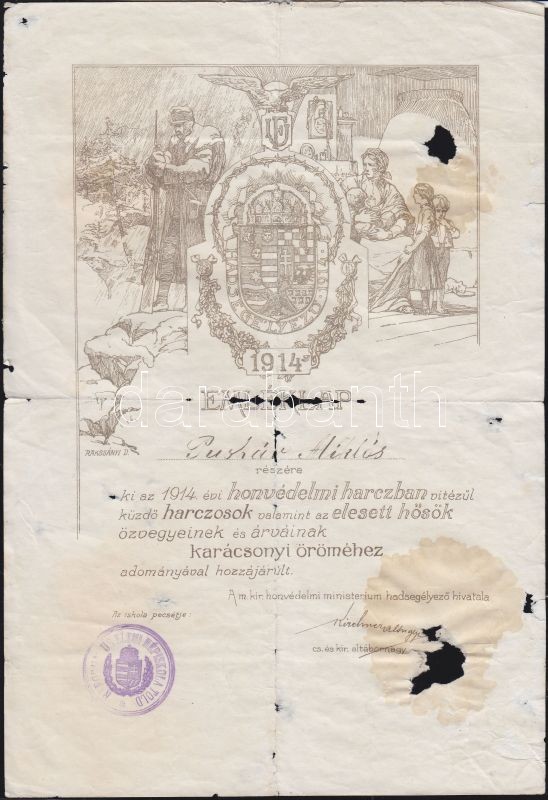 Beschreibung: 1914 Karácsnyi emléklap a harcban elesett hősök özvegyeinek és árváinak (sérült) + 1852 Bűnfenyítő Törvényszék idézése