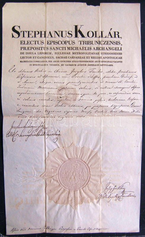 Beschreibung: 1836 Kollár papírján Rudnyánszky József és Viber József püspökök aláírása