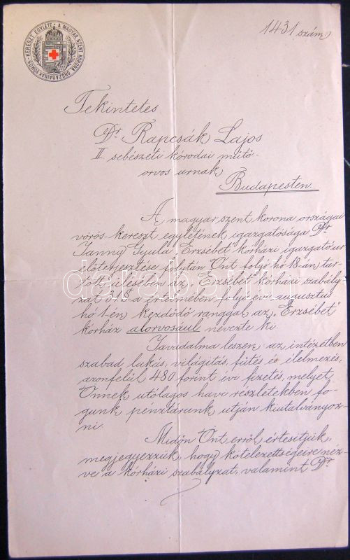 Beschreibung: 1894 gróf Csekonics Endre és Darányi Ignác aláírása Magyar Vöröskeresztes papíron