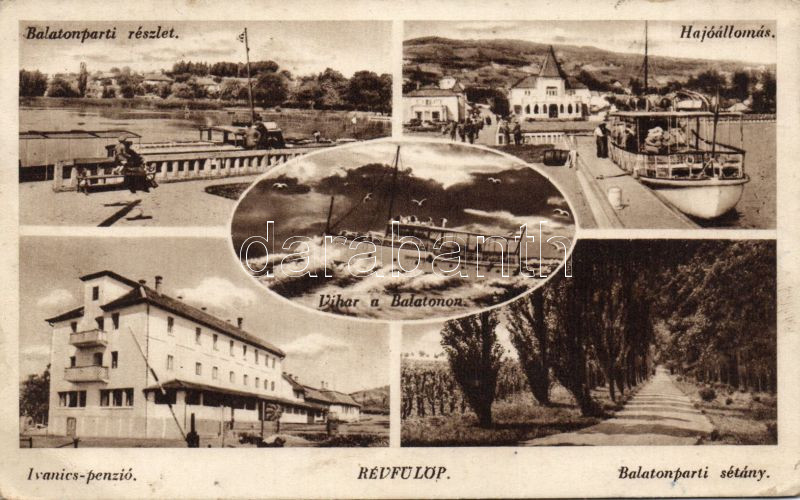 Révfülöp Hajóállomással és az Ivanics penzióval (Rb) https://www.darabanth.com/de/135-Fernauktion/135.0/Ansichtskarten/Ungarn~400006/Revfulop-Hajoallomassal-es-az-Ivanics-penzioval-Rb~II389683