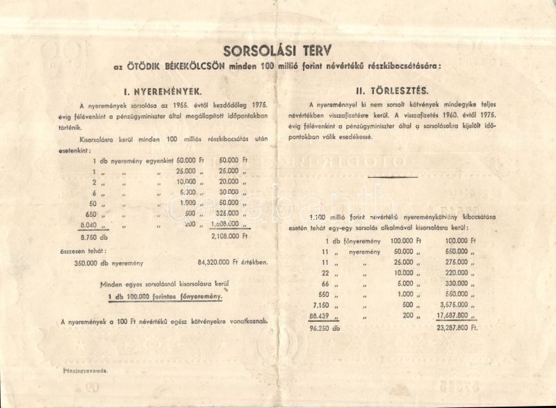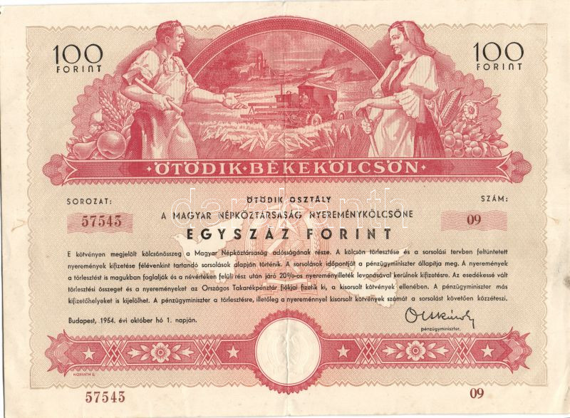 1954. "Ötödik Békekölcsön" a Magyar Népköztársaság Nyereménykölcsöne 100Ft-ról