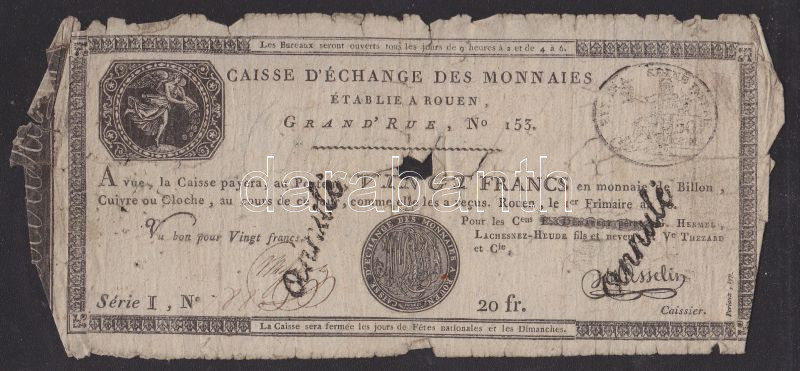 Franciaország / Rouen 1797-1803. 20Fr T:IV- R! https://www.darabanth.com/de/135-Fernauktion/135.0/Numismatik/Auslandische-Banknoten~400023/Franciaorszag-Rouen-1797-1803-20Fr-TIV-R~II184511