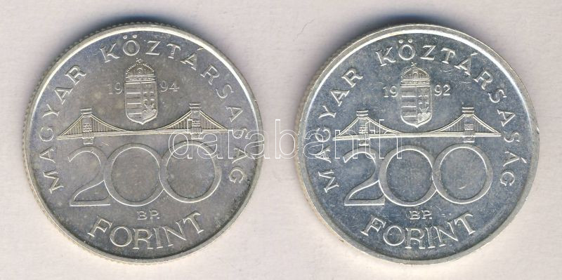 1992. 200Ft "MNB" Ag T:1 + 1994. 200Ft Ag "Deák" T:2 https://www.darabanth.com/de/135-Fernauktion/135.0/Numismatik/Munzen-mit-Ungarischen-Munzzeichen~400035/1992-200Ft-MNB-Ag-T1-plus-1994-200Ft-Ag-Deak-T2~II386207