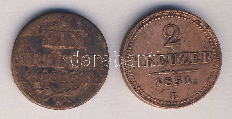 Ausztria/magyar verdejel 1816B 1Kr T:4 + 1851B 2Kr T:3+ https://www.darabanth.com/de/135-Fernauktion/135.0/Numismatik/Munzen-mit-Ungarischen-Munzzeichen~400035/Ausztriamagyar-verdejel-1816B-1Kr-T4-plus-1851B-2Kr-T3plus~II380858