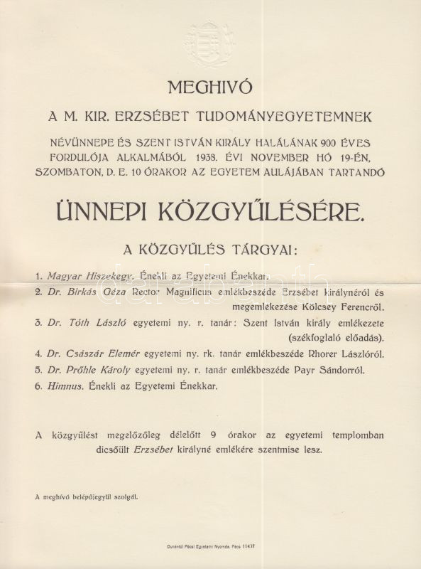 Beschreibung: 1938 Meghívó a Magyar Királyi Erzsébet Tudományegyetem ünnepi közgyűlésére
