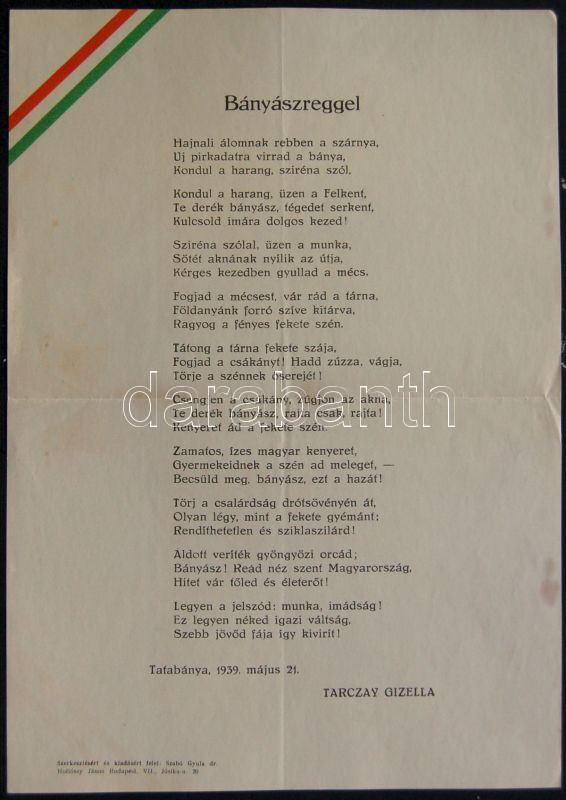 1939 Tarczay Gizella: Bányászreggel című hazafias propaganda verse nem... https://www.darabanth.com/de/136-Fernauktion/136.0/Andere-Sammelgebiete/Drucksachen~223/1939-Tarczay-Gizella-Banyaszreggel-cimu-hazafias-propaganda-verse-nemzeti-zaszlos-papiron~II394104