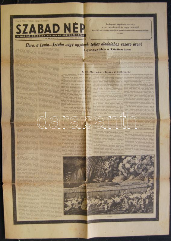 Beschreibung: 1953 Szabad Nép újság száma Gerő Ernő elvtárs beszédével a Sztálin-téri gyásznagygyűlésen