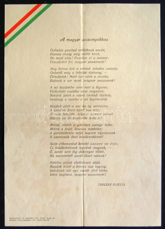 Beschreibung: Tarczay Gizella: A magyar asszonyokhoz című hazafias propaganda verse nemzeti zászlós papíron