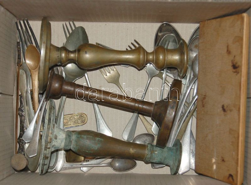 Beschreibung: Vegyes bolhapiac tétel: sok jelzett alpakka evőeszköz, némelyik régi magyar szállodákból, alpakka gyertyatartók kések, díszek