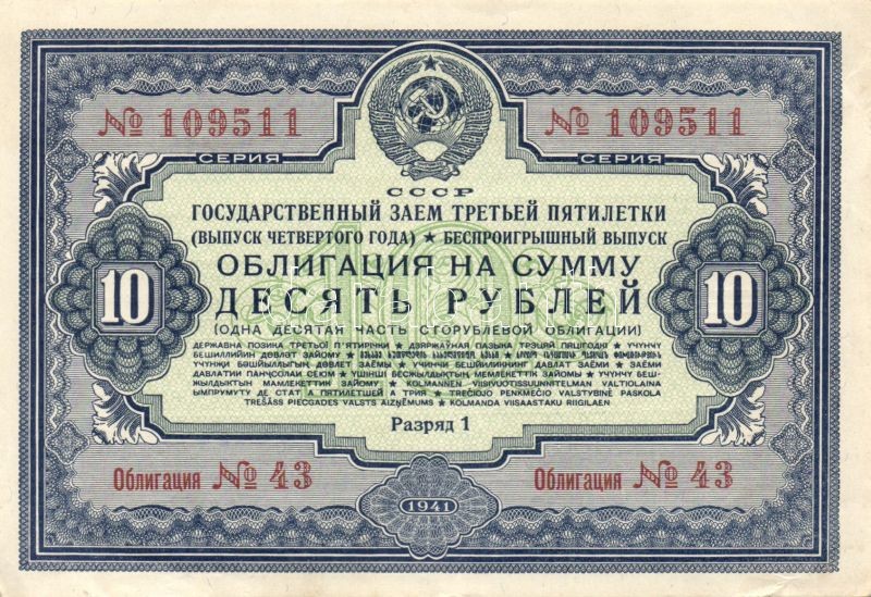 Oroszország/Szovjetunió 1941. 10R sorsjegy, pénzhelyettesítő fizetőeszköz (4x) ,egymás utáni sorszámmal, T:II,III