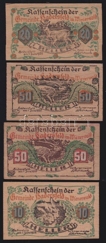 Ausztria (Gemeinde Hadersfeld im Wienerwald) 1920.június 1. 10H + 20H + 50H (2x) fa pénztárjegy T:I,II,II- / Austria (Gemeinde Hadersfeld im Wienerwald) 1920. 1. June 10H + 20H + 50H (2x) wooden treasury note C:Unc,EF,VF