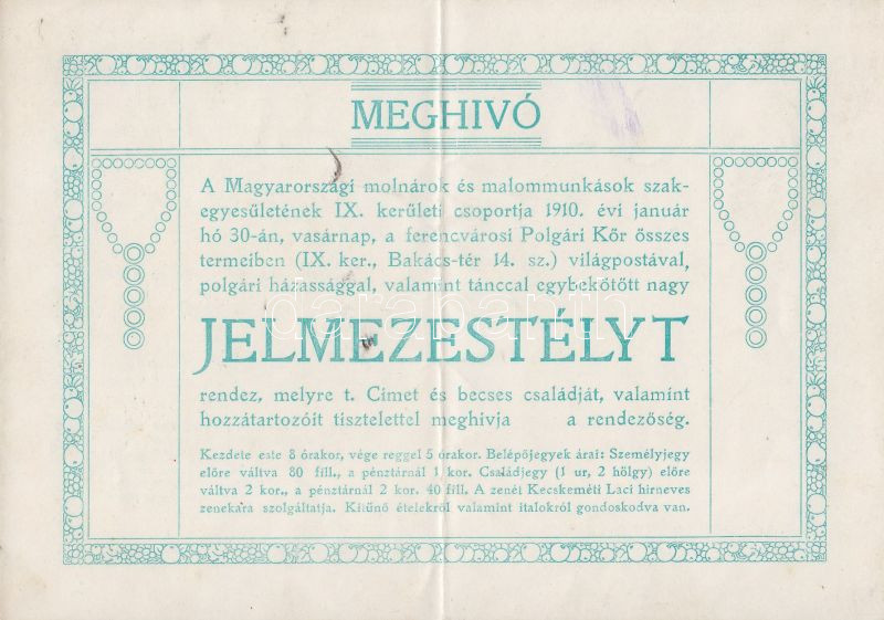 1910 Meghívó táncrenddel a Magyarországi molnárok és malommunkások sza... https://www.darabanth.com/de/137-Fernauktion/137.0/Andere-Sammelgebiete/Drucksachen~292/1910-Meghivo-tancrenddel-a-Magyarorszagi-molnarok-es-malommunkasok-szakegyesuletenek-Jelmez~II398581