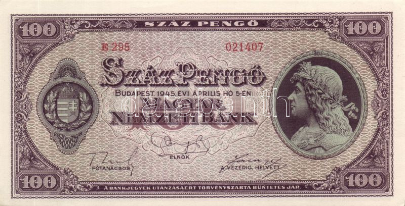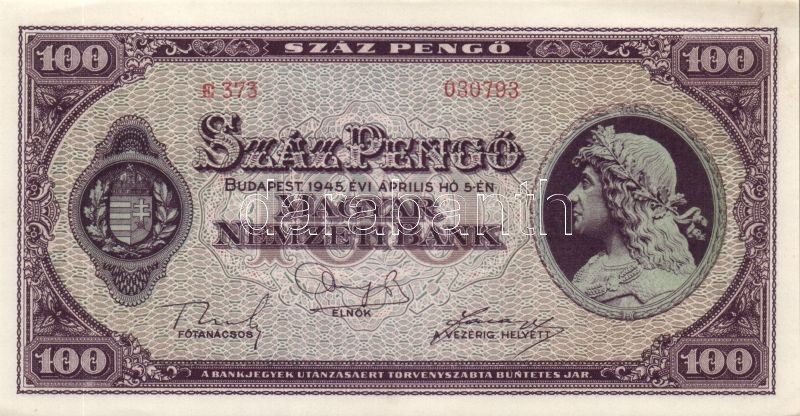 1945. 100P (3x) köztük kettő közeli sorszámú T:I- https://www.darabanth.com/de/137-Fernauktion/137.0/Numismatik/Ungarische-banknoten~500088/1945-100P-3x-koztuk-ketto-kozeli-sorszamu-TI-~II395358