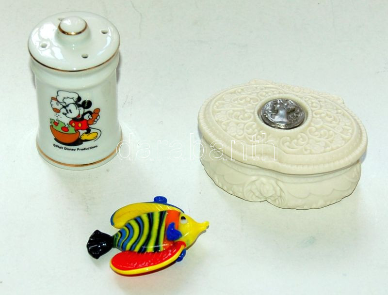 Beschreibung: Festetlen porcelán dobozka, muránói üvegfüggő, porcelán Mickey Mouse sótartó