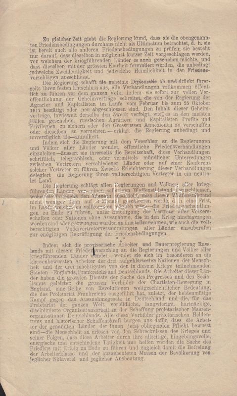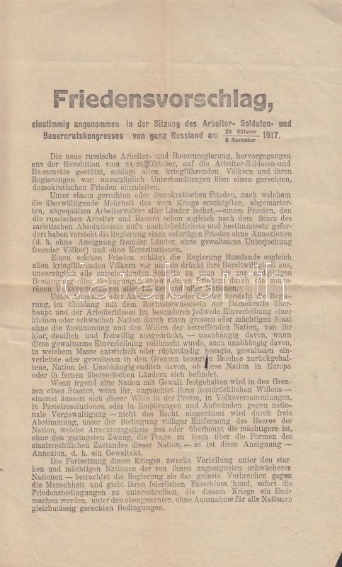 Beschreibung: 1917 Orosz röplap, a szovjetkormány békeajánlatának kivonatával német nyelven / Offer for peace-treaty flyer from the new Soviet government in German