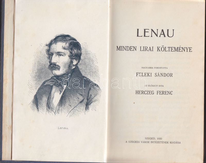 Lenau minden lírai költeménye. ford.: Feleki Sándor, az előszót írta Herczegh Ferenc, Szegedi vakok intézetének kiadása 1930 + a Vakok Intézetének előfizetési felhívása