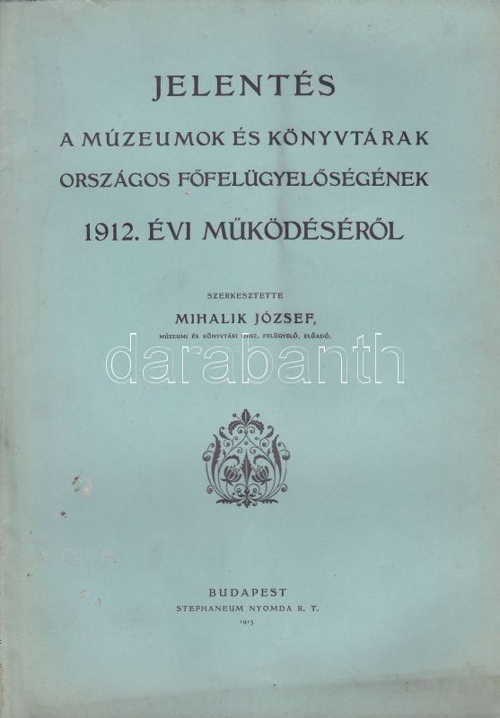 Mihalik József: Jelentés a múzeumok és könyvtárak orsz. főfelügyelőség... https://www.darabanth.com/de/139-Fernauktion/139.0/Andere-Sammelgebiete/Bucher-sonstige-Raritaten~11022/Mihalik-Jozsef-Jelentes-a-muzeumok-es-konyvtarak-orsz-fofelugyelosegenek-1912-evi-mu~II397414