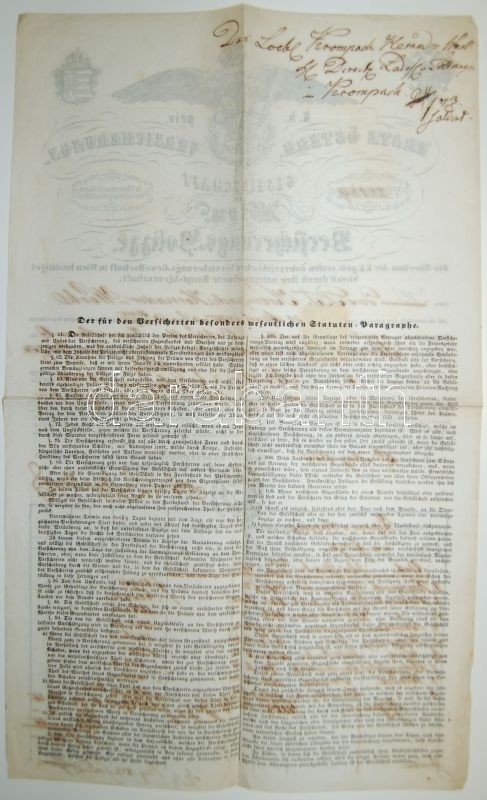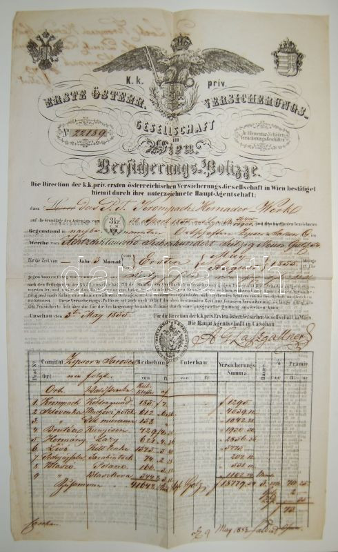 1855 A Korompai Hernád gépgyár által kötött biztosítási szerződés 3kr CM okmánybélyeggel / Insurance-document with 3kr CM document stamp by the Krompach Hernader mashine-works