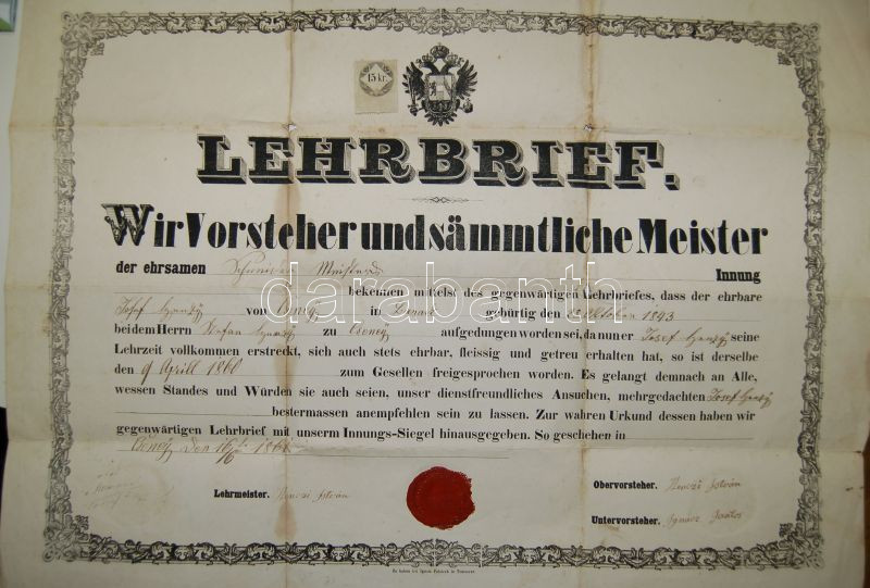 1861 Szabólegény szabadulólevele Temesvár 15kr okmánybélyeggel 58x42 c... https://www.darabanth.com/de/139-Fernauktion/139.0/Andere-Sammelgebiete/Dokument~11004/1861-Szabolegeny-szabadulolevele-Temesvar-15kr-okmanybelyeggel-58x42-cm~II406197