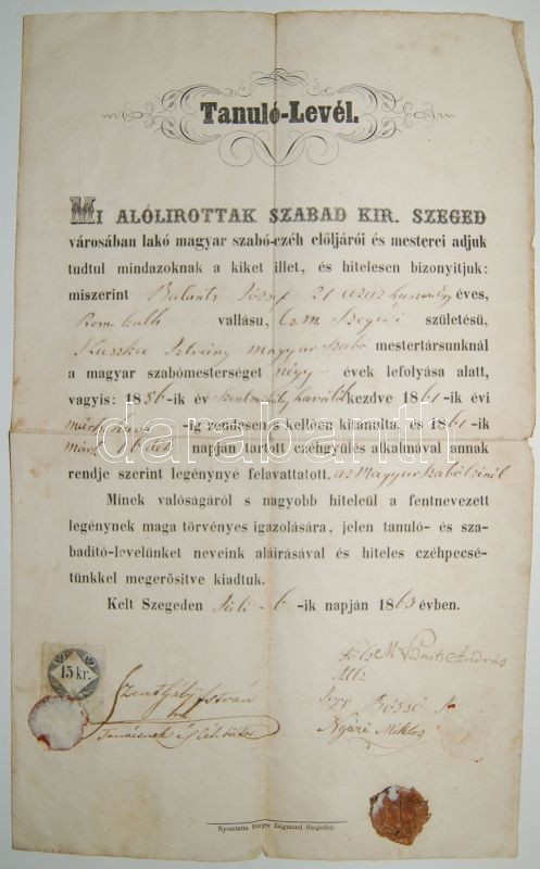 1863 Szegedi szabó-céh tanuló és szabadítólevele 15kr okmánybélyeggel ... https://www.darabanth.com/de/139-Fernauktion/139.0/Andere-Sammelgebiete/Dokument~11004/1863-Szegedi-szabo-ceh-tanulo-es-szabaditolevele-15kr-okmanybelyeggel-es-serult-viaszpecs~II406152