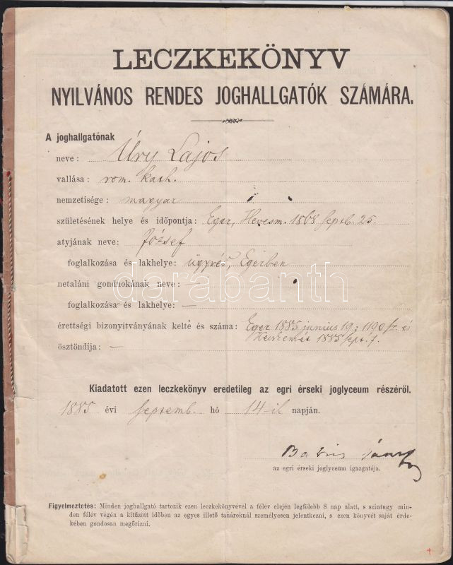 1876-1910 Úry Lajos Curiai tanácselnök főbíró iratgayatéka: gimnáziumi bizonytványai és joghallgatói leckekönyve az Egri érseki joglíceumból aláírásokkal