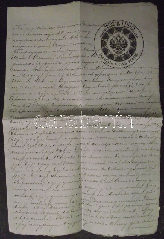 Oroszország 1896 Okmány 28 Rubeles szignettával, szép címeres vízjelle... https://www.darabanth.com/de/139-Fernauktion/139.0/Andere-Sammelgebiete/Dokument~11004/Oroszorszag-1896-Okmany-28-Rubeles-szignettaval-szep-cimeres-vizjellel~II408750