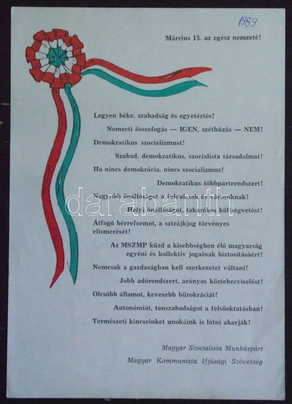 1989 Az MSZMP és a KISZ március 15. szórólapja https://www.darabanth.com/de/139-Fernauktion/139.0/Andere-Sammelgebiete/Historische-Dokumenten-Handschriften~11005/1989-Az-MSZMP-es-a-KISZ-marcius-15-szorolapja~II405064