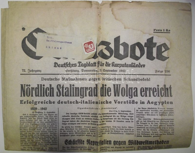 1942 Grenzbote német nyelvű lap a kárpáti németeknek benne a siekres sztálingrádi harcok hírei / Paper for the Germans in the carpathen with the news of the Stalingrad battle