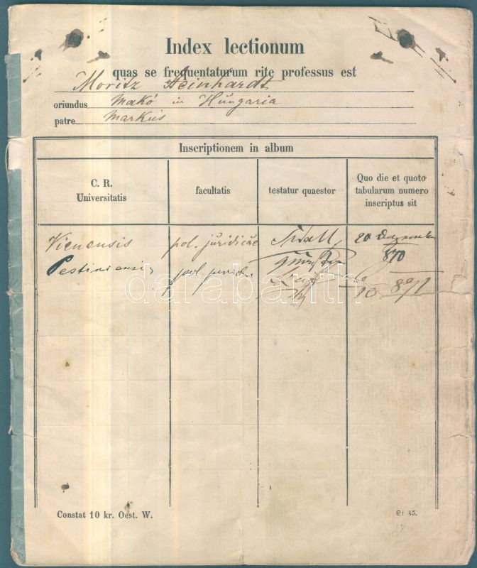 1871 Bécsben és Pesten tanuló joghallgató leckekönyve híres jogtudósok: Rudolf Jhering, Wenzel Gusztáv, Apathy, Sághy, Hajnik, Lechner és mások (borító hiányzik)