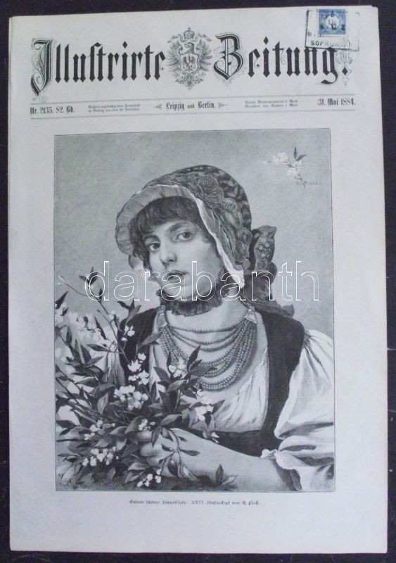 Beschreibung: 1884. 3db Illustrirte Zeitung címlap kivágott majd visszaragasztott 1868. 1Kr hírlapilleték bélyeg fiskális bélyegzéssel, Sopron