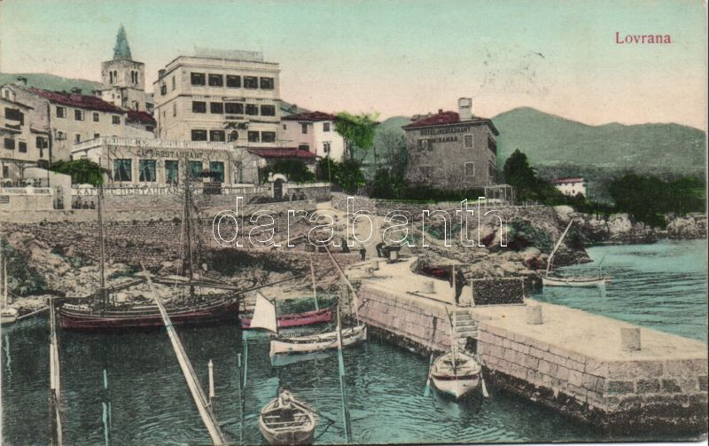 Lovran yacht station with Hotel Miramar and Hotel Königsvilla https://www.darabanth.com/de/139-Fernauktion/139.0/Ansichtskarten/Kroatien~11038/Lovran-yacht-station-with-Hotel-Miramar-and-Hotel-Konigsvilla~II406059