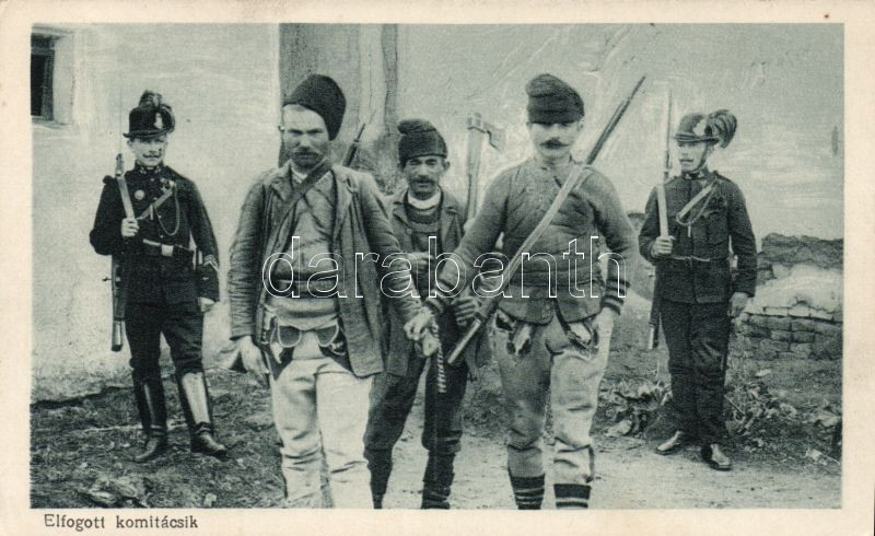 Bulgarian freedom-fighters (komitácsik) caught by gendarmerie officers https://www.darabanth.com/de/139-Fernauktion/139.0/Ansichtskarten/Militar~11083/Bulgarian-freedom-fighters-komitacsik-caught-by-gendarmerie-officers~II407951