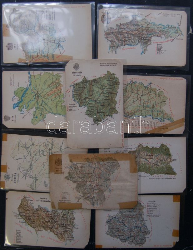 Beschreibung: 10 db megíratlan régi térképes képeslap, nagyrészt a Történelmi Magyarország területéről (sérült állapotban) / 10 Map postcards, T:4