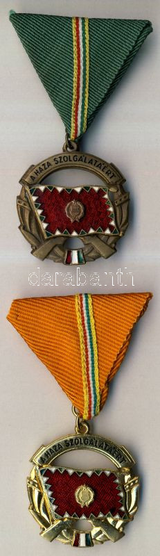 Beschreibung: 1956. A Haza Szolgálatáért Emlékérem I. és II. fokozata a Magyar Népköztársaság 1949-es címerével, szalagsávval, eredeti dísztokban! T:1